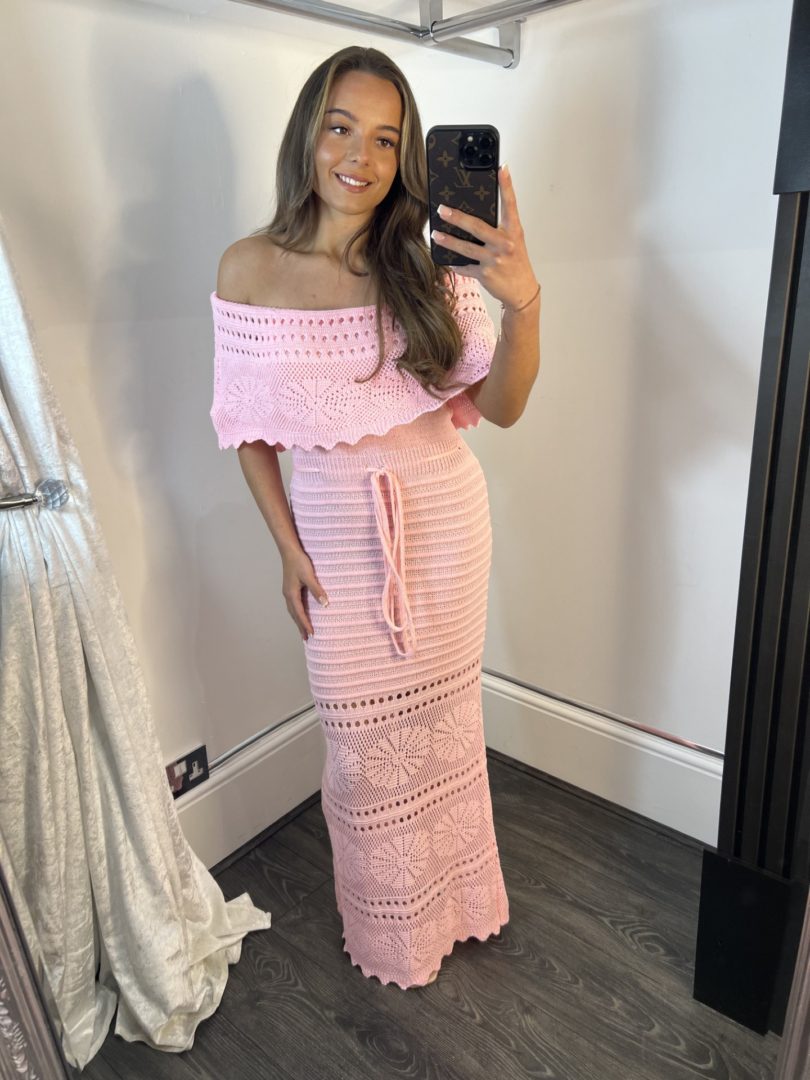 - Ribbed Detail Bardot Style Midi Dress With Faux Fur Detail
