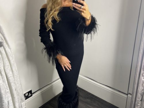 - Ribbed Detail Bardot Style Midi Dress With Faux Fur Detail