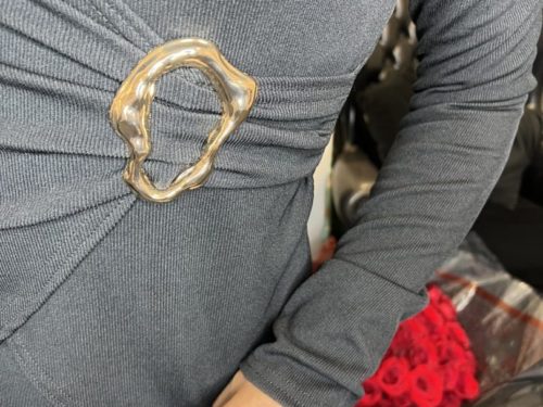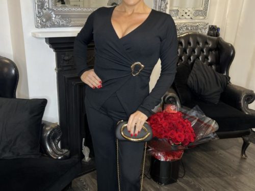 - Deep V Neck Jumpsuit With Gold Broach And Tie Neck Detail