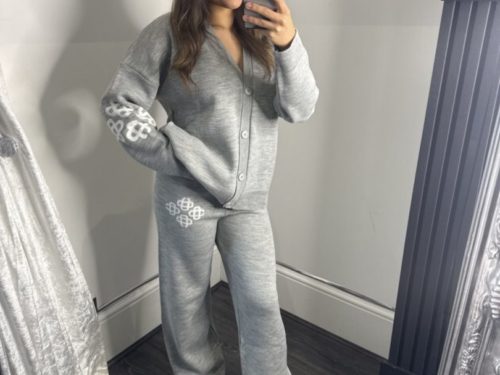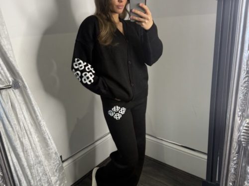 - Fine Knit Cardigan & Wide Leg Trousers With Swirl Detail Logo