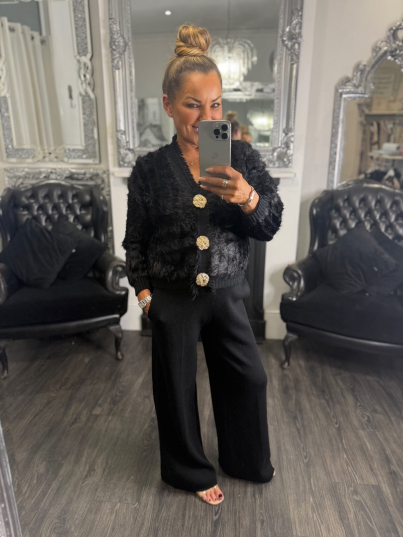 - Knitted Gold Button Cardigan With Contrast Cuff’s And Wide Leg Trouser Co-ord